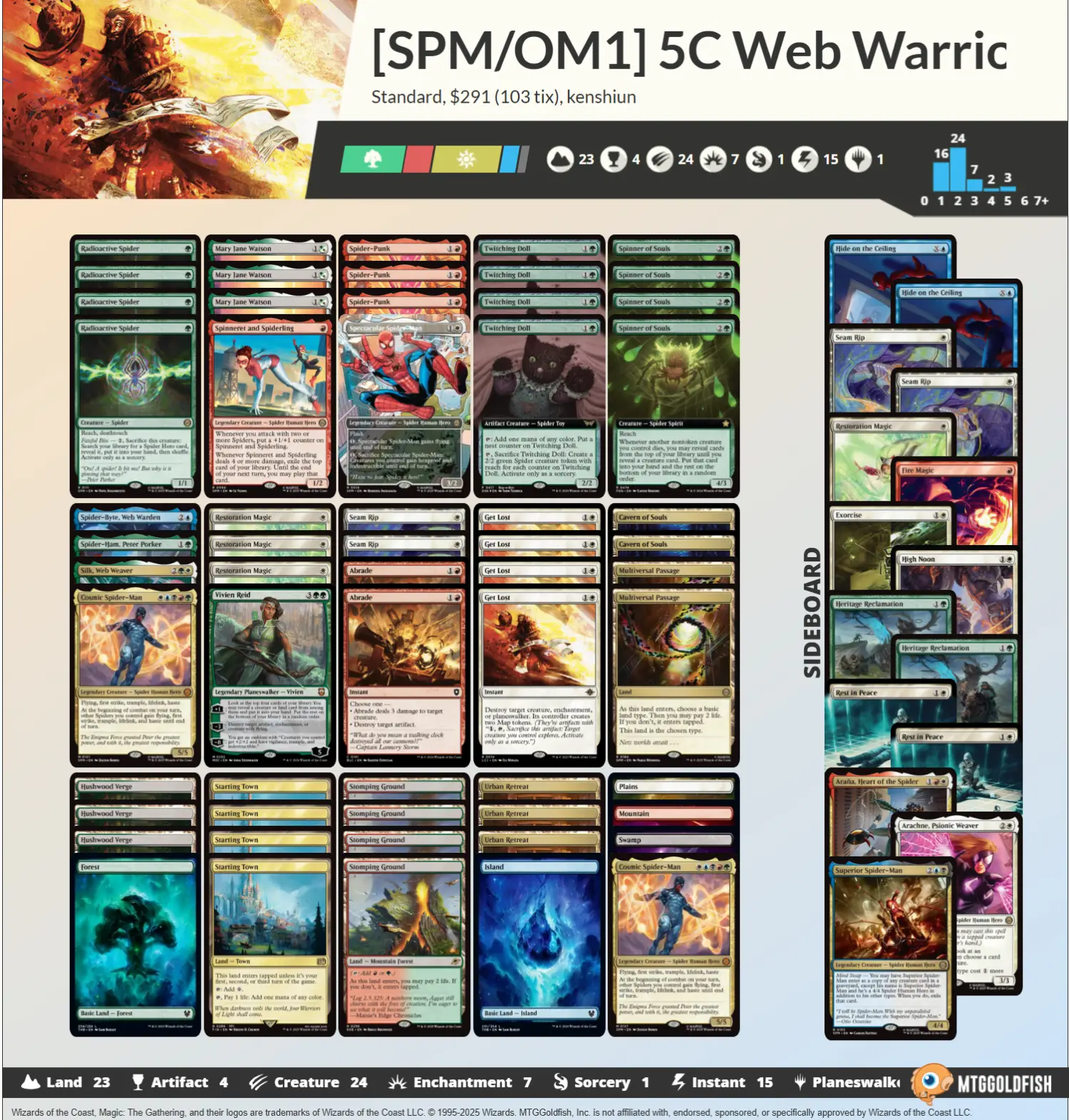 五色蜘蛛人的代表生物是宇宙蜘蛛人,在套牌中的定位是最後收頭兵器,戰階時將五條關鍵字異能共享給你全家蜘蛛生物,但只是單純的關鍵字堆疊,稱不上是套牌關鍵核心,整體來說沒什麼好談的。所以本文的核心單卡介紹就給導師生物放射性蜘蛛了。一費1/1死觸延勢是非常有嚇阻力的組合,光是站在場上就會讓對手的生物不敢隨意進攻,打過去對手也不太願意送衍生物以外的生物阻擋,所以無論是初期防守還是打過去後拿來做蛛絲甩蕩(Web-slinging)都很合適。犧牲可以將牌庫中的蜘蛛英雄生物找上手,等於是蜘蛛人專屬導師。應用牌表如下: