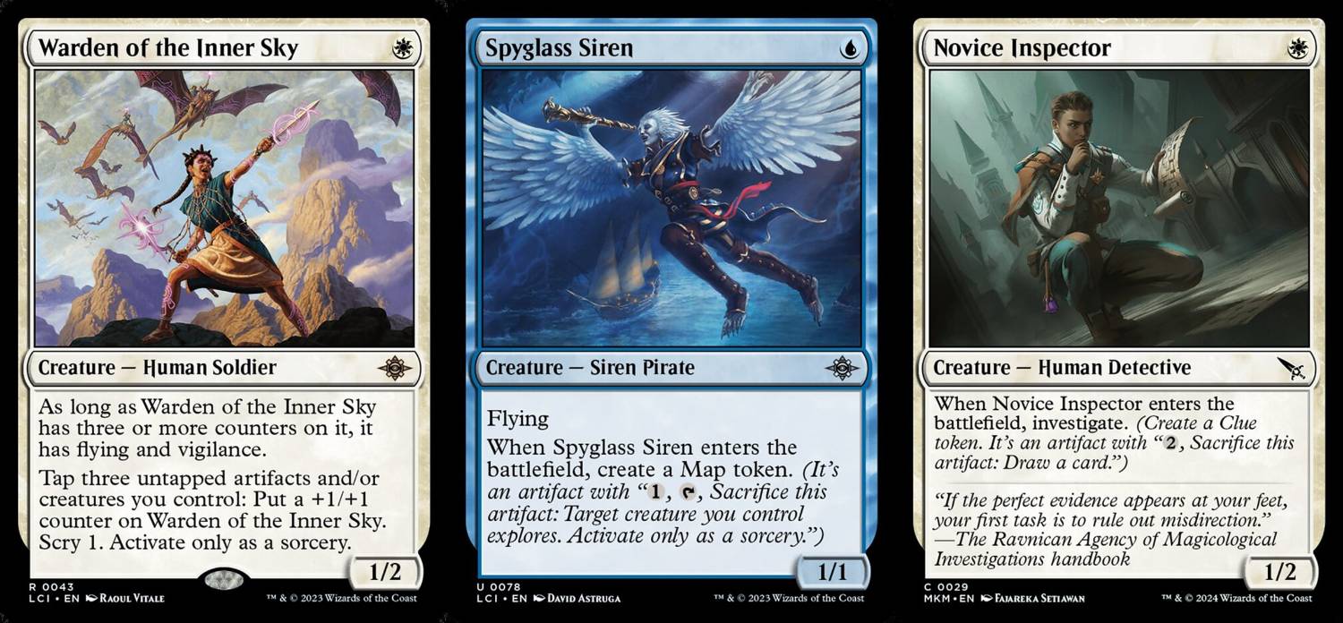 Warden of the Inner Sky可配合Novice Inspector及Spyglass Siren快速濾牌(Convoke?)。濾牌之外還會幫自己放counter,3個counter以上會有警戒跟飛行,越過陸地生物。若前兩回合有搭上神器生物,第三回合基本上就是飛行警戒,可以輕鬆造成巨大壓力。