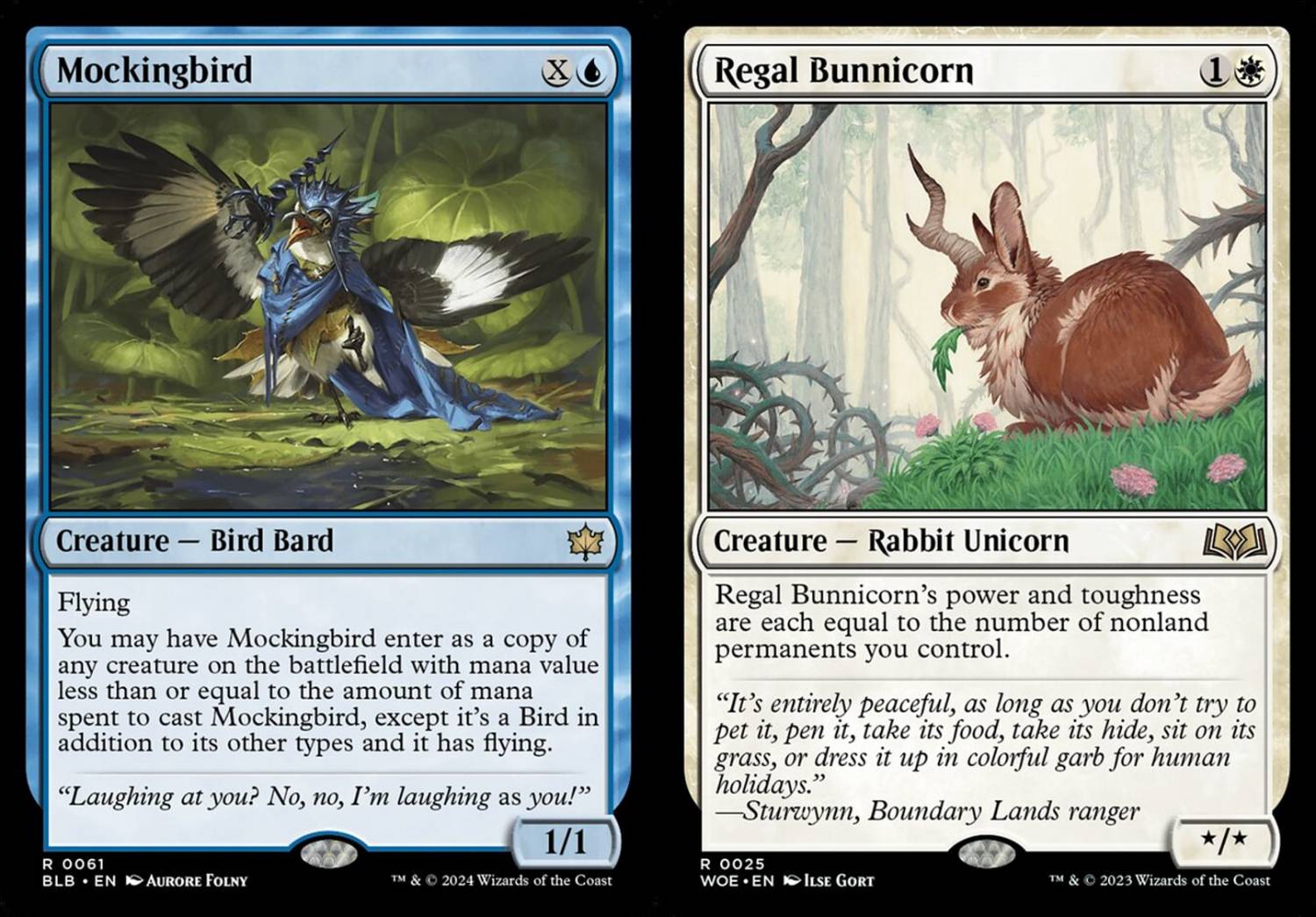 Mockingbird在前期可複製生物增加打點還會飛。最常見的combo大概就是複製兔子或是複製神器生物。如果遇到大仔就複製對面,像複製到黑綠的Thrun, Breaker of Silence,他們也可能遭遇解不掉自己生物的窘境。