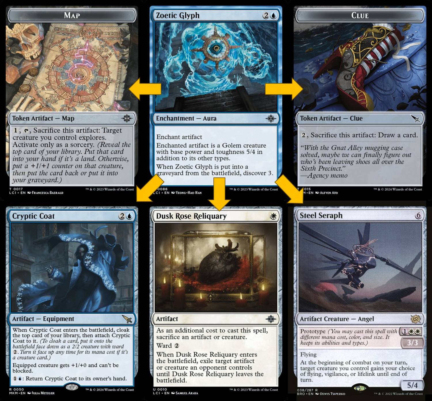 Steel Seraph則是不怕GFTT的神器天使,如果場上沒有神器,可以選擇貼皮Zoetic Glyph變成5/4天使,進戰階時可以選擇生物警戒、飛行、繫命,要補血就繫命,要扁人就飛行。但這隻需要3點法力,以構築來講有點擠,所以我只放1隻。