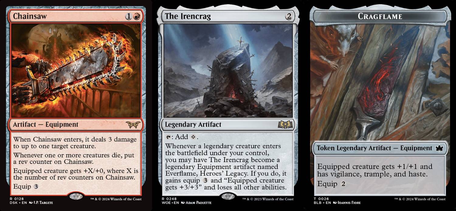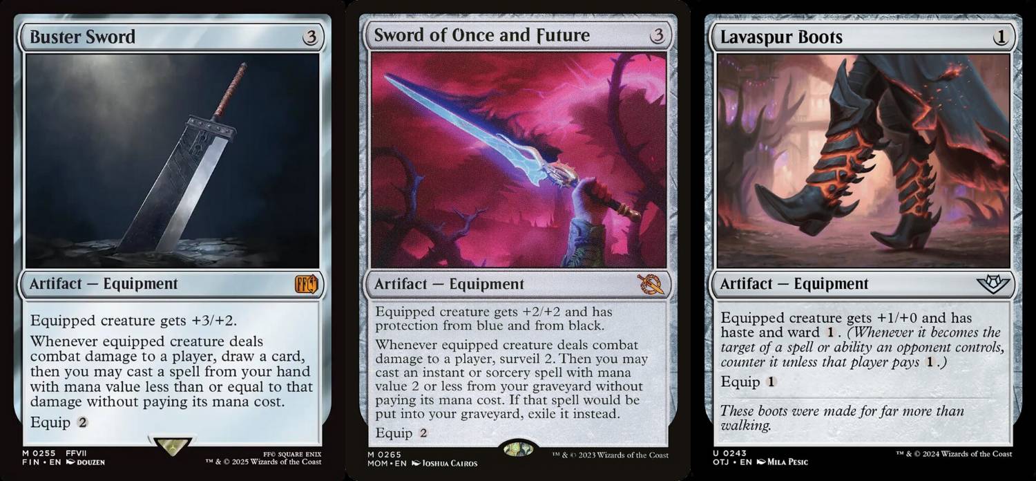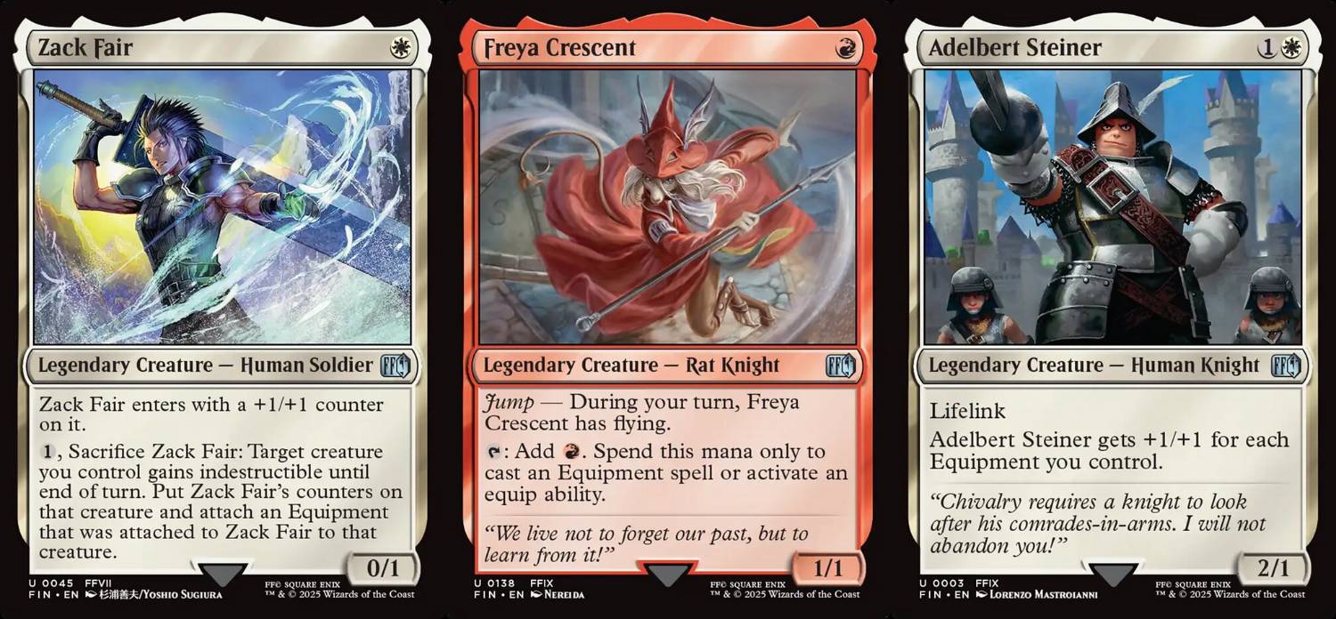 除了克勞德外,《FINAL FANTASY》還有許多武具互動的傳奇,筆者選用的是毀滅劍的原持有者札克斯、FFIX的龍騎士芙雷婭與冥王隊隊長斯坦納。札克斯是提供隊友一次性防護的一費生物,因為會連其身上的一個武具一同交給被保護的生物,所以可以給他佩帶武具當作打點使用;芙雷婭是武具專用一費mana頭,幫助你在二回快速拍出銳鋒城塞戰鞭,在主回合還有龍騎士的專屬飛行被動,可作為穿透打點使用;斯坦納則是強大的回血引擎,體格會依據你操控的武具數量成長,是與快攻互毆時的最佳夥伴。