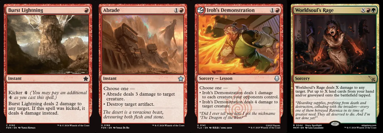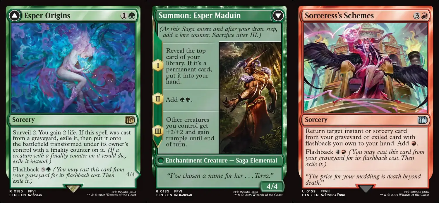 最後是咒語。由於套牌設計帶有些許堆墳性質,故採用幻獸起源與魔女的野心的返照組合。幻獸起源從墳場施放時會轉化成FFVI的幻獸馬丁,他可以做到濾牌、補血、抽牌、加速、全家灌大,不僅進場就能先抽一張回來,走到第三階時還能讓迎賓鎮民或夥伴衍生物發揮打擊力。魔女的野心是撿墳場的瞬間巫術或放逐區的返照牌,不僅可以從墳場再次使用,還可將放逐區的幻獸起源或另一張魔女的野心拿回手,只要法力夠多,就能無限回收咒語。去除選用可直擊的閃電迸發、處理神器的風化侵蝕、可點燒可掃場的愛和的示範,以及一張X費對任意目標直擊等量傷害兼挖最多等量地進場的奧義世界之魂怒火做收頭招。