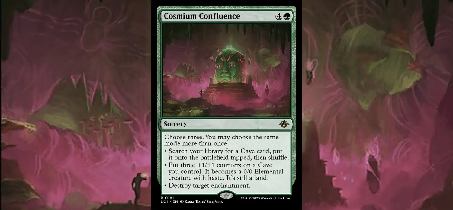 那麼洞窟主題又是長什麼樣子呢?簡單來說,就是以宇金交匯作為核心:找洞窟橫置進場/目標洞窟變0/0生物,並在其上放三個+1/+1指示物/消滅目標結界,可選三次,且可重複選同一選項,不僅功能多樣,還相當有彈性。而結界又正好是當前標準環境的大宗類別,一張宇金交匯可以拆三張結界,對上結界主軸套牌時反制力相當強。