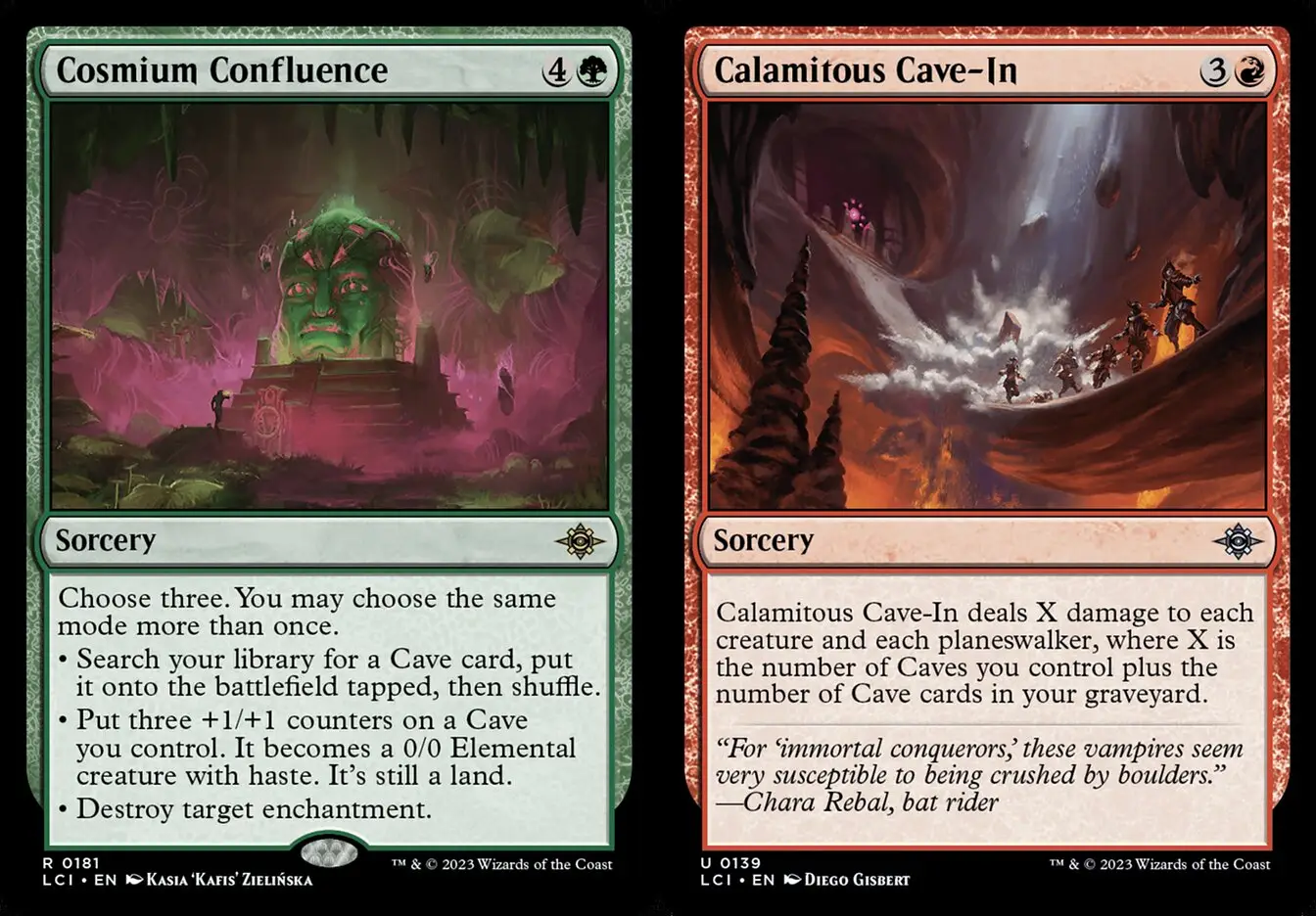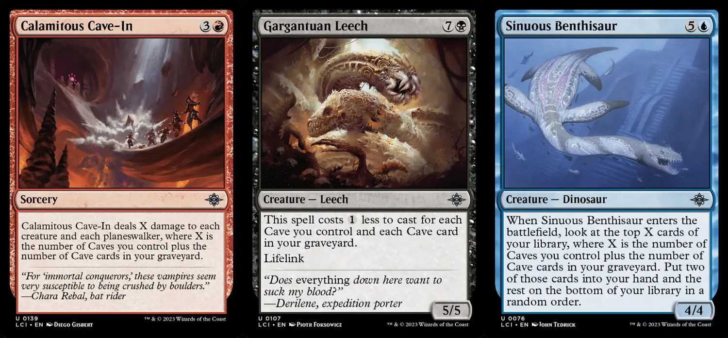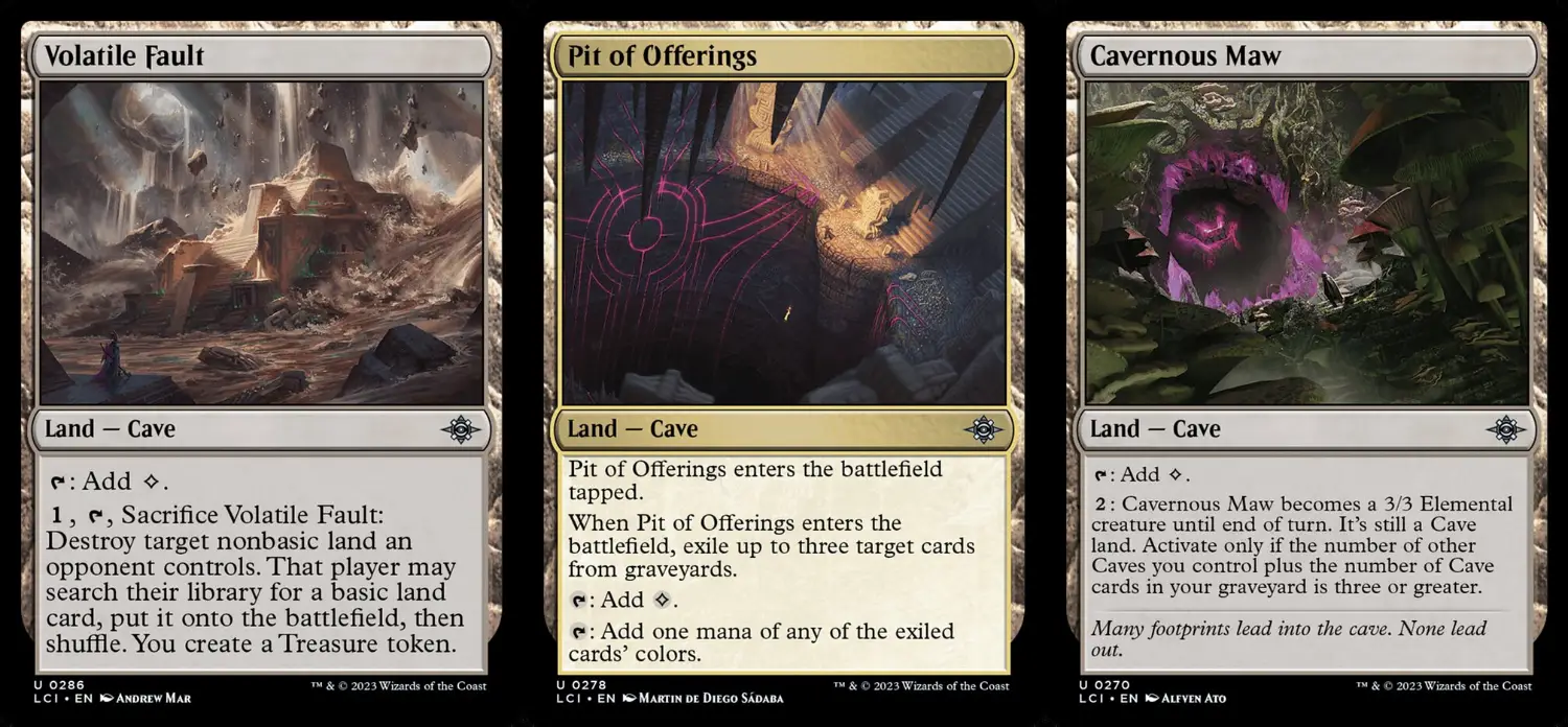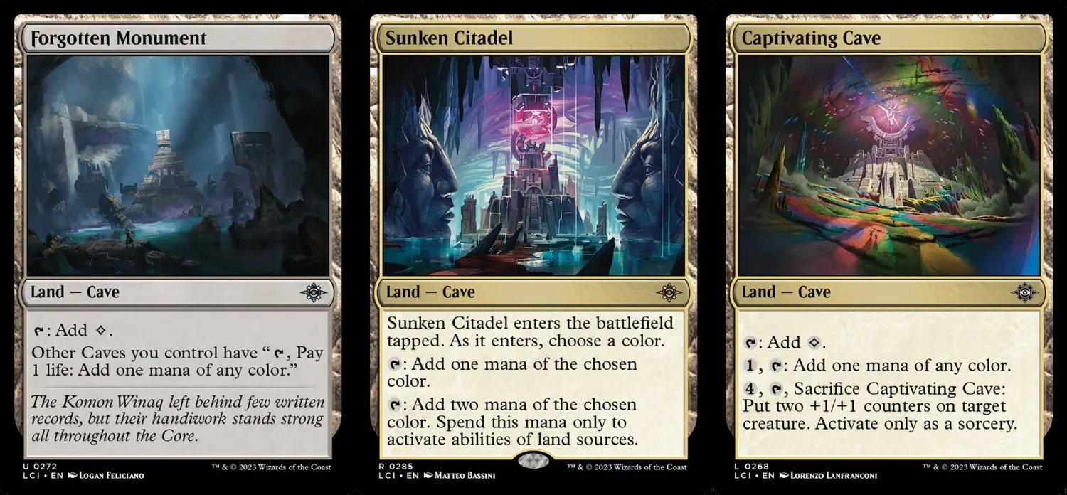 此外,看洞窟數量的互動牌多半會看場上+墳場洞窟數量去計算,所以就算把洞窟犧牲掉或是被對手炸了,都不會對這些牌造成影響,像是對所有生物和旅法造成洞窟數量傷害的掃場災難塌陷/依照洞窟數量減費的繫命生物龐巨蛭/濾牌深度等同於洞窟數量的補手牌生物曲身深海龍等,都有著高於其他地牌主題的穩定性。而各種常見的功能地需求也有對應的洞窟變體版本,整個體系看起來相當完整,但有個巨大的缺陷:洞窟沒有雙色地。雖然有讓其他洞窟獲得產任意色能力的無色洞窟遺世紀念碑,只是在你抽到它或把它找出來前,轉起色來的體驗甚至比只放基本地的多色套牌還差。