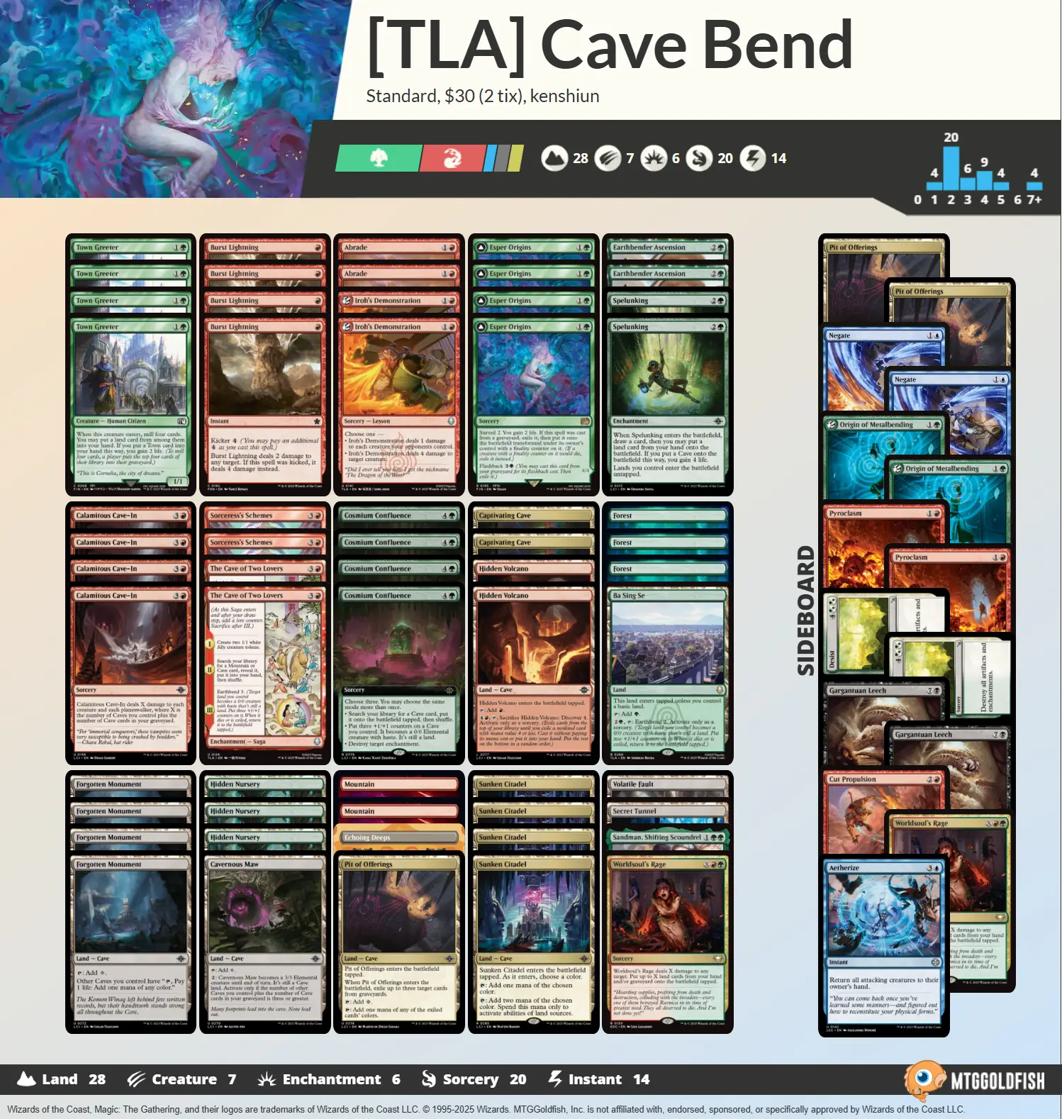 首先從地牌構成來介紹。作為骨幹的調色牌,是放滿賦予其他洞窟產任意色能力的遺世紀念碑,以及進場選色的沉沒殿堂,然後補個兩張魅惑洞窟,數字湊到十張。包含可以犧牲傾探的單色洞窟蔽匿苗圃、蔽匿火山與基本地,把兩個顏色調到基準值(15張)上下,其他則是功能地。因為洞窟系統的導師能力很強,基本上功能地只需要放個一張即可,需要哪張直接找。有主力打手秘密隧道、炸地的動盪斷層、放逐墳場的獻祭死淵、變身地巨窟洞口、功能地進墳時的替代方案迴響深淵,以及唯一的非洞窟功能地永固城霸新塞。