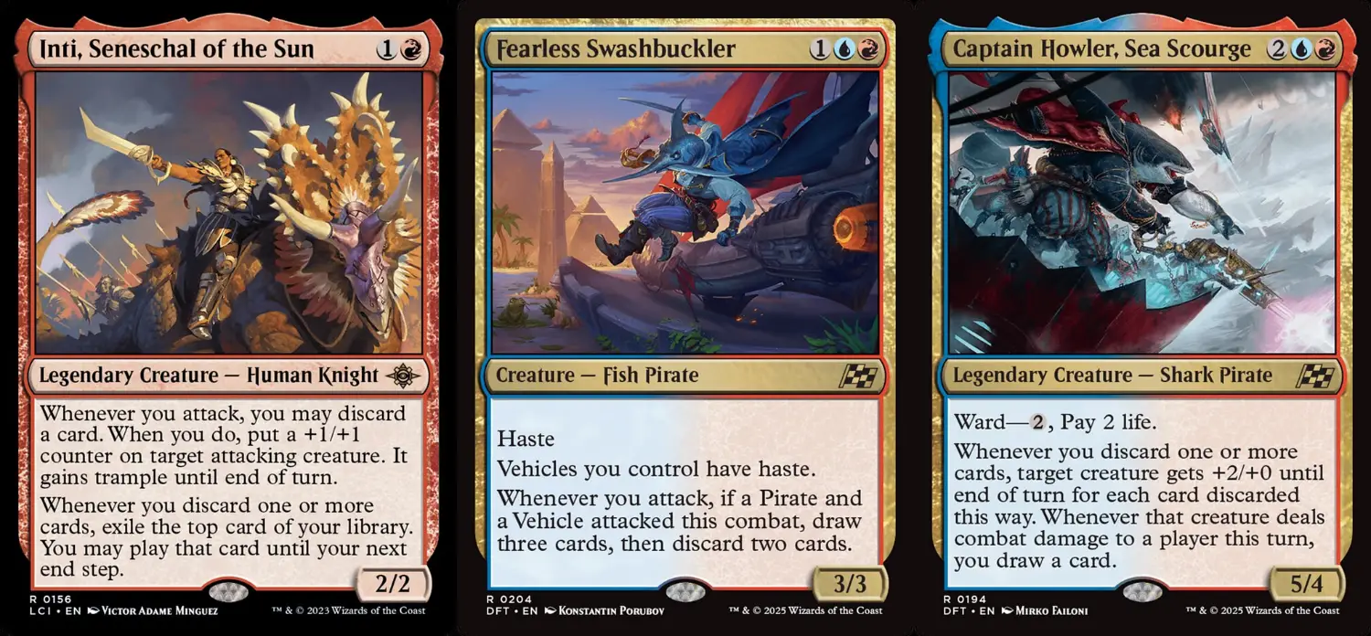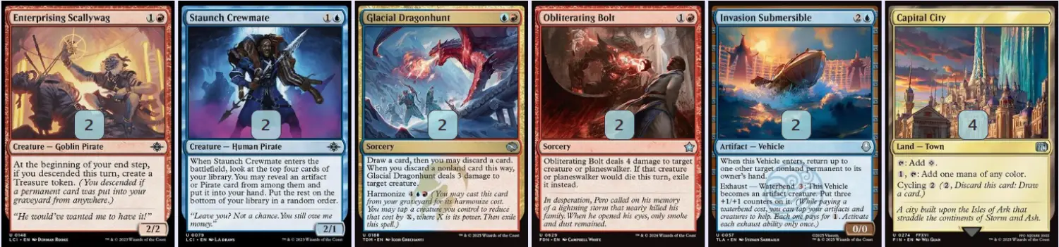 海盜主題以《乙太漂移》的棄牌載具海盜為核心,輔《依夏蘭迷窟》的海盜種族協同效應構成。從預組的稀有牌配置來看,由烈陽提督因提、無畏仗劍客和強力稀有載具協同的棄牌,觸發劫掠鯖鯊、搜掠空鰩、蒼海之災嚎勒船長的能力,藉此增強輸出與補充資源。