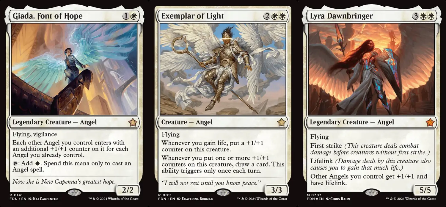 天使主題以希望聖源吉婭妲為核心,加速施放天使並被動增強天使的體格,搭配勵志監管使、明光模範與星空牧者等帶資源的天使,以及給全家繫命的天使領主黎明使者萊拉所構成。天使主題本身有先驅等級的戰力,核心組件有在《基石構築》重印,可用效期相當長。這套預組策略清晰,輸出和資源能力都有一定水準,只要順勢展開就能輕易擊倒對手,還配有兩張扭轉場面劣勢的四散分開,直接拿來和一般標準套牌對打也不會全無勝算。這樣的套牌有銅板價改良方式嗎?其實是有的。