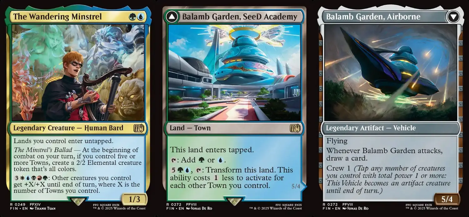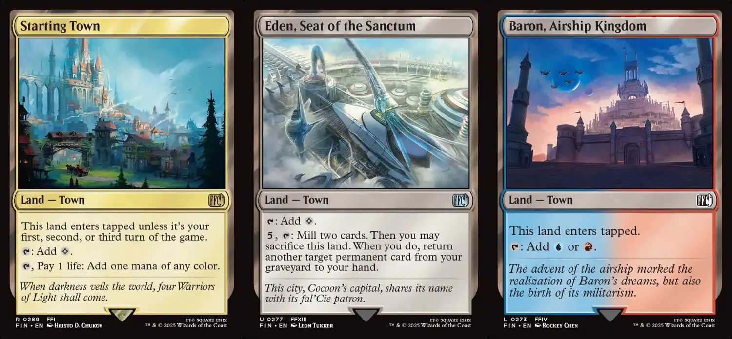 筆者選擇的市鎮元件為異國的詩人、SeeD學院巴拉姆學苑、初始市鎮、聖府首都伊甸,以及純調色市鎮飛空艇王國巴隆。異國的詩人吉田P是市鎮主題的殺招,在你湊到五張以上的市鎮時會持續派出元素衍生物,還可以全家灌大一波帶走對手,只是市鎮湊到五張前實在沒什麼用,故僅配兩張。SeeD學院巴拉姆學苑是另一個殺招,它可以轉化成翔空巴拉姆學苑從空中削減對手血量並抽牌補資源,加上正面不是傳奇,可以放好放滿。聖府首都伊甸則是後期回收資源用。