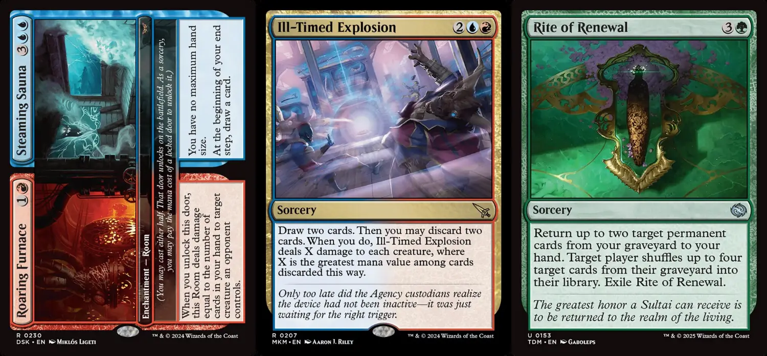 至於其他去除方面,筆者選用閃電迸發、隕石撞擊、雙喉襲暴龍、熱火熔爐間+蒸氣桑拿室與厄時爆炸,整體來說重視射程以及與普羅恩普特的搭配性。閃電迸發可收頭及增幅提升傷害;隕石撞擊清理難解的小生物與神器,省得看它們在戰場墳場來來回回;預兆射程高達5的雙喉襲暴龍在初始市鎮及珍寶的輔助下也可正拍回血;熱火熔爐間+蒸氣桑拿室在遊戲初期及後期都有不錯的射程,也可兼作抽牌引擎使用;厄時爆炸在本副套牌的掃場射程高達7,能單純當抽牌咒語使用這點是筆者欣賞的地方。最後再補一張復新儀式回收墳場資源提高續戰力。