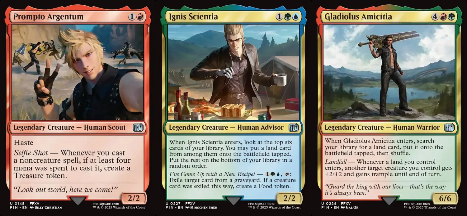 這副套牌由玩家扮演諾克提斯,帶領這三位夥伴駕車遊歷市鎮,順道把對手車過去。三位夥伴與車的共通特徵是加速,愛拍照的陽光男孩普羅恩普特在你施放支付四費以上的非生物咒語時送你珍寶做紀念;負責開車的眼鏡青年伊格尼斯進場會加速一塊地,還能料理對手的墳場做干擾兼生食物;身強體壯的貼身護衛格拉迪歐藍斯則是有著太古泰坦的體格與進場搜尋任意地的能力,並在地落時灌隊友+2/+2踐踏,是收頭時的關鍵要角之一。與三位夥伴搭配的敞篷車雷格里亞則是攻擊時會翻一塊地進場,本身四費可以觸發普羅恩普特的生珍寶,到這裡,相信各位讀者已經看出整個魔法力曲線的樣貌:二回普羅恩普特→三回伊格尼斯→四回雷格里亞→五回格拉迪歐藍斯。套牌構成如下: