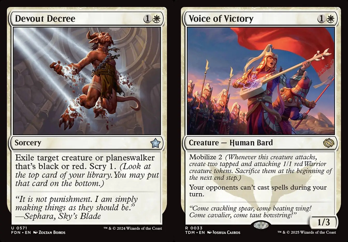 因為這副牌的爆發點之一來自連續的低費施放強力咒語,所以日正當中能構成不小的干擾,虔誠裁決&驅除惡靈在這對局中也算是泛用去除,至於消除魔障就真的是只為了尊重遊蕩王座了,這東西不立刻盯住場面很容易瞬間失控。此外對於備牌中保護咒語與護航康放的較多的對手來說,可能是需要祈勝歌手替掃場做犧牲打的。