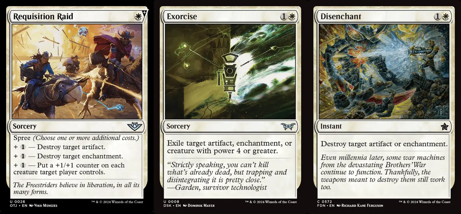 比較共通的就是靈技的打手或關鍵資源點,常常是神器或結界,所以對神器結界去除會特別有用。以及紅藍靈技的放逐燒有億點多,所以永續無瑕體很容易甚麼牌都賺不到就消失了,但完全不帶又反而能讓對手省下一堆卡位放其他有效針對牌,所以留下一點比較能增加對手決策困難度。