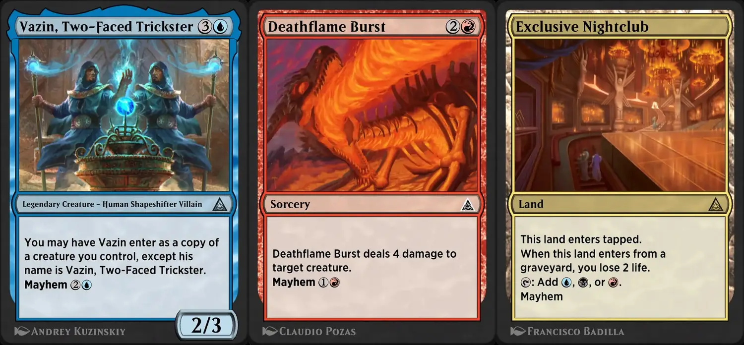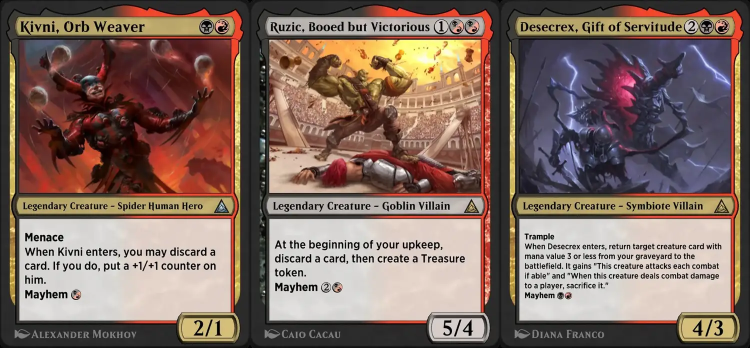 《漫威蜘蛛人》反派最具代表性的機制是瘋亂(Mayhem),是過去瘋魔(Madness)異能的變化型,瘋亂單卡雖然在體格等方面強過瘋魔牌,但有施放時機的限制,不能像瘋魔那樣花式操作,而且這類異能需要先有棄牌才能運作,組強攻非常吃手順,組中慢速會被自己的強制棄牌打亂節奏,丟進既有的抽棄牌型又有些格格不入,有什麼構築方式可以克服嗎?
