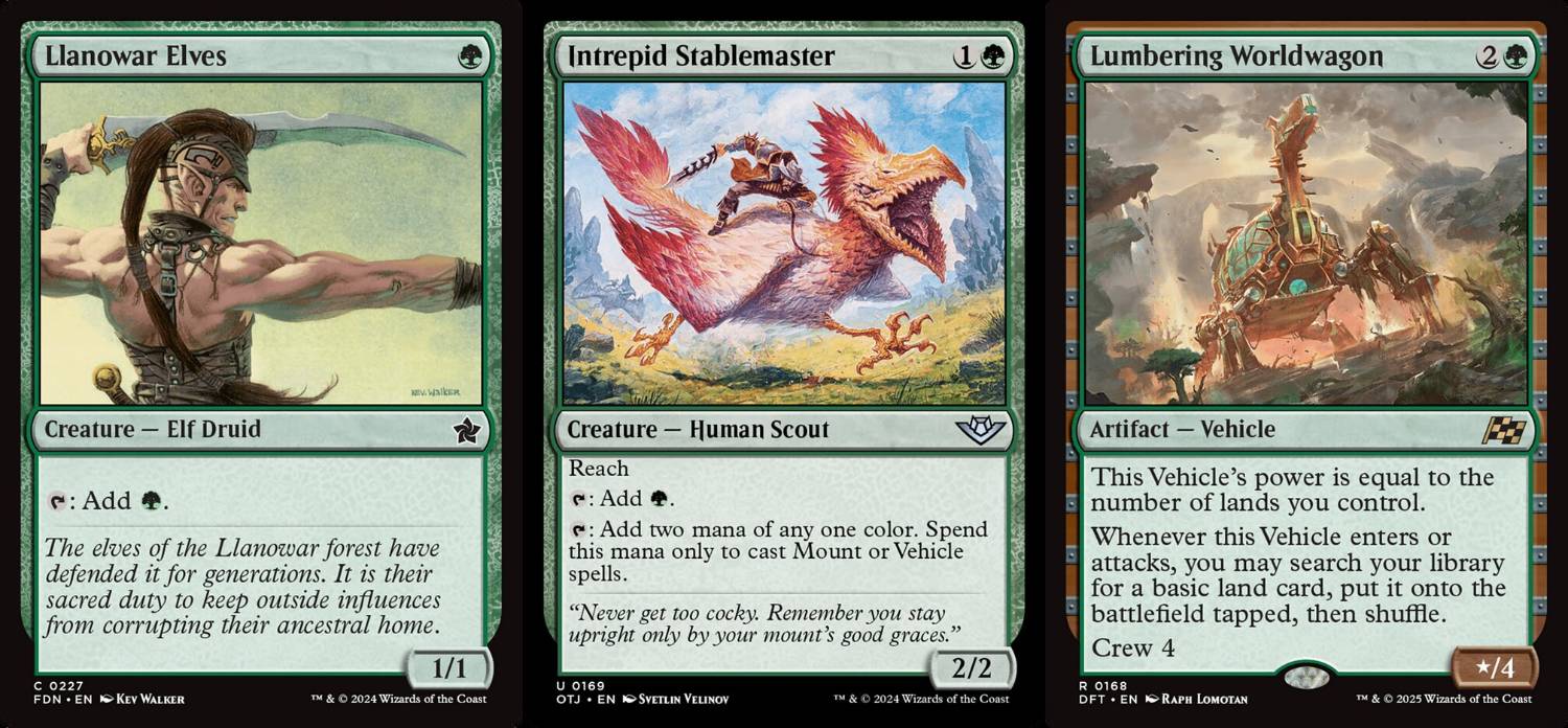 首先我們要把執守日魘快速叫出來,魔法力加速是至關重要的部分。在《基石構築》回歸標準的羅堰妖精、《光雷驛鏢客》推出的坐騎載具專屬mana頭無畏廄館主,還有本系列的載具型綠霸主、進場或攻擊時可找基本地躺進的伐木載世機,節奏上是一跳三跳五費或是二跳五費,力拚三回拍出執守日魘。