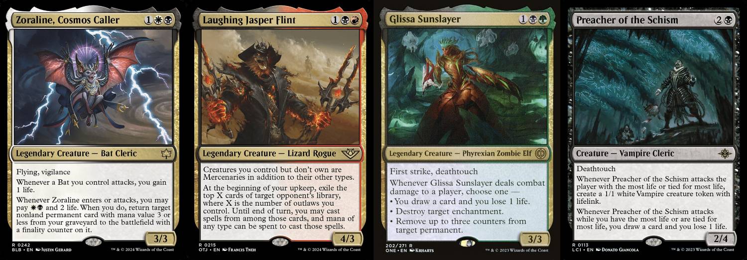 以下為筆者撰文當下,依金魚網MetaGame統計,套牌使用率由高往低排列,其中有被使用的符合條件生物,時間跨度分別搜索過 7Days 、 14Days 、 30Days ,但老實說,結果幾乎不變,只是部分順位交換。另外追加個當下雖沒資料,但因為DSK是結界環境而被榮譽提名的永世陰謀家祖爾: