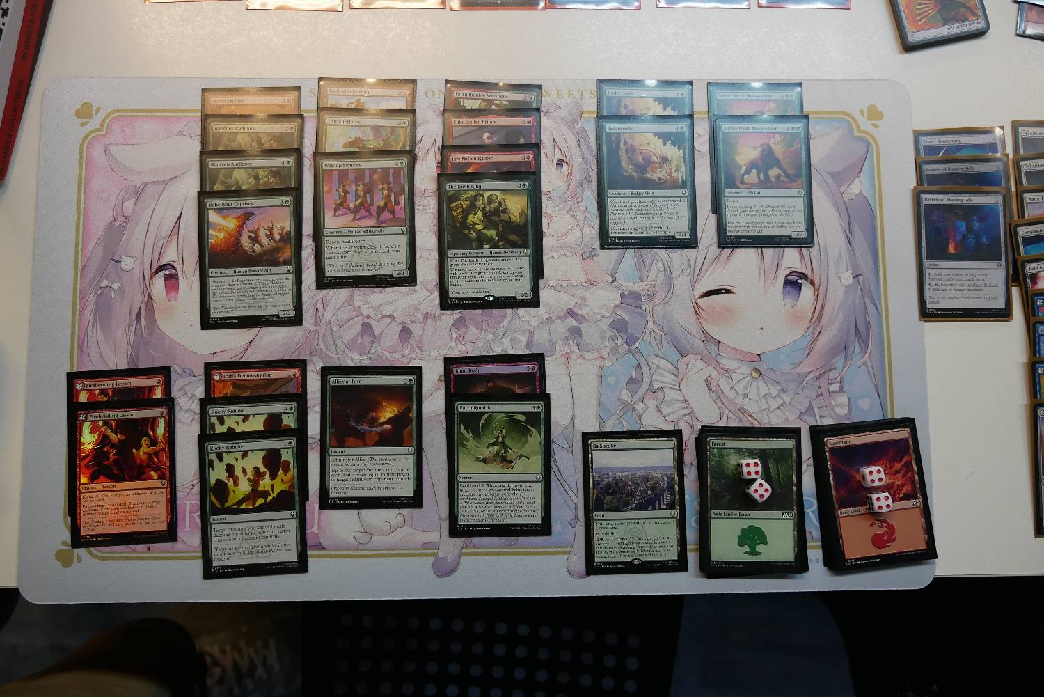 所以在玩這系列輪抽時,推薦在第一包的前5抽,就要規劃完自己這系列的遊戲計畫想走哪邊了,如果是要進特定主題,那就要開始激進搶思路牌;不過也還是有不用太強求搭配的組法,像我這次組的紅綠,就只是把生物跟去除按比例放一放就搞定,畢竟運土神通即使沒任何搭配,憑空生出一個有攻防的生物就是戰力保證了,對於沒自信在輪抽中扣出一套有完整協同主題套牌的新手,這是個比較好上手的挑牌模式。