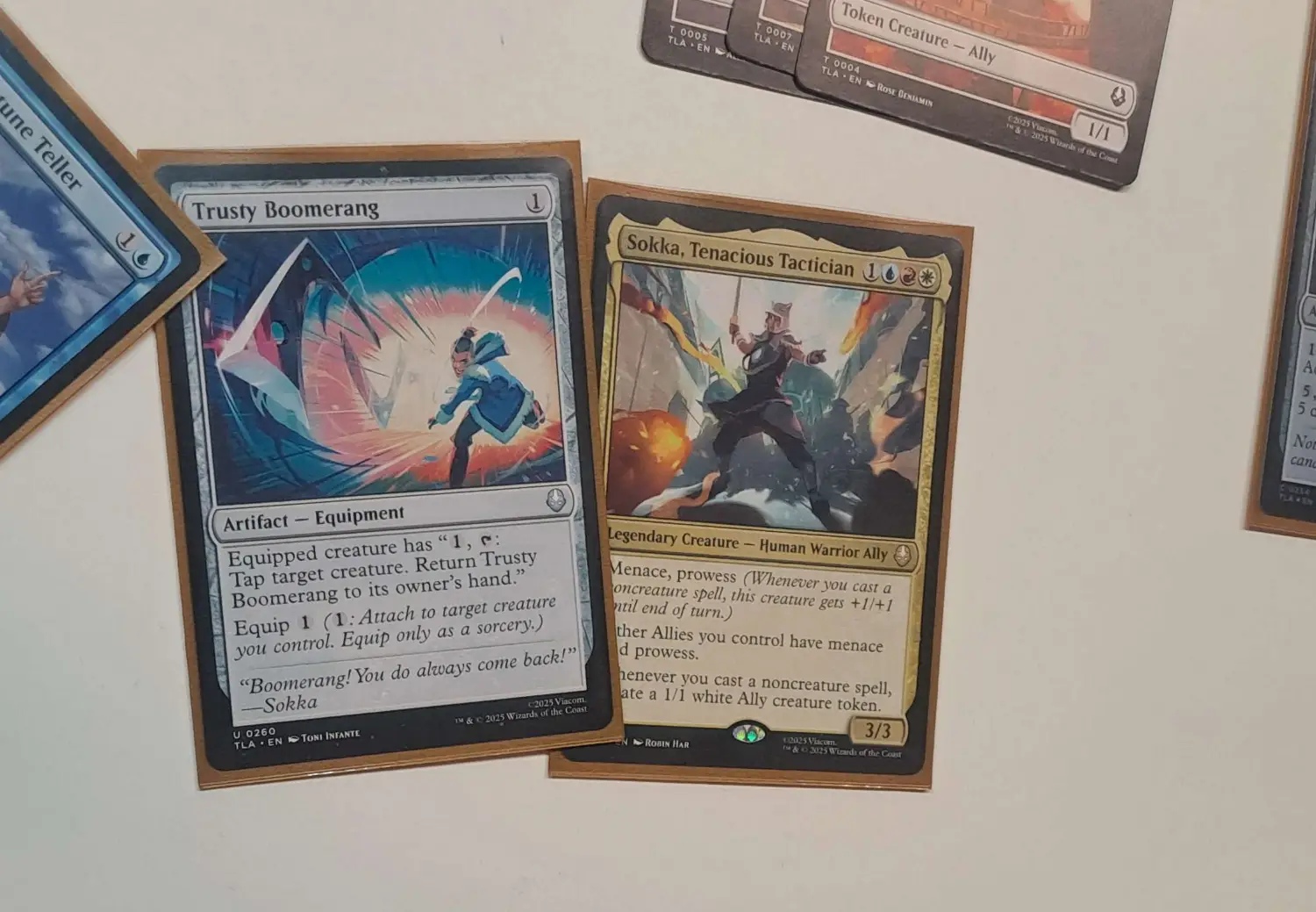 在第一局的最後一個回合中,我透過Sokka, Tenacious Tactician與Trusty Boomerang的組合,裝備Trusty Boomerang給前幾回合叫出的Ally Token們,不斷橫置對手生物的同時積累Prowess的觸發,成功贏下那場遊戲。