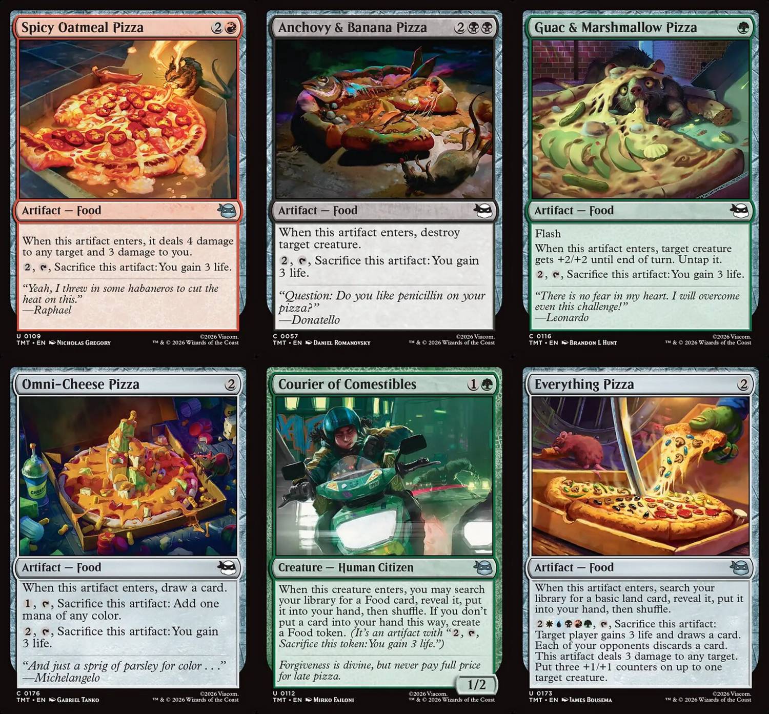 美食運手的牌張設計也非常的棒!如果你牌庫裡找得出一張需要的食品牌,恭喜你,外送準時送達,你獲得了一份熱騰騰的披薩!即使你找不到,你仍會獲得一個冷掉的披薩(一個「普通」的食品token,還是蠻好吃的),但你請他送餐所支付的 {一}{綠} 可是不能退的。只要讀讀那段風味文字,你就能感受到用一張牌說一個小故事的獨特魅力!