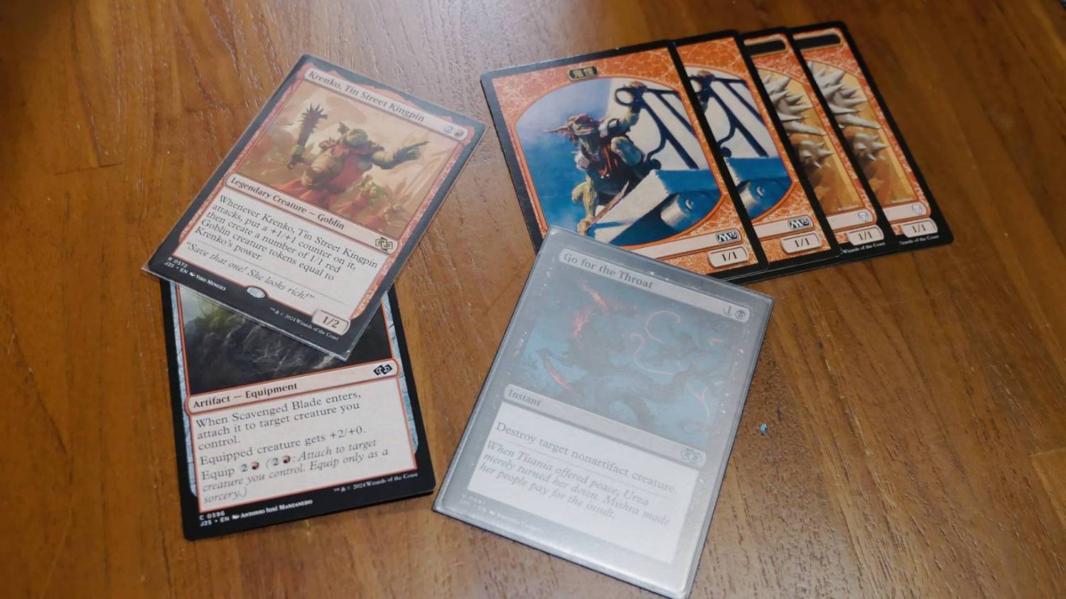三人說好打開卡包以後,只看主題而不看卡牌內容。第一場由我對決柏宇。我開出黑色噁心蟲蟲加上紅色哥布林的組合,柏宇則是綠色地落加上白色補血的搭配。三塊地時我準時拍下Krenko, Tin Street Kingpin,下回合再拍一張Scavenged Blade,快速打4並生出四隻1/1哥布林。再過一回合,柏宇應該認為手牌無力對抗我的海量雜魚軍團了,選擇投降,表情有點凝重。