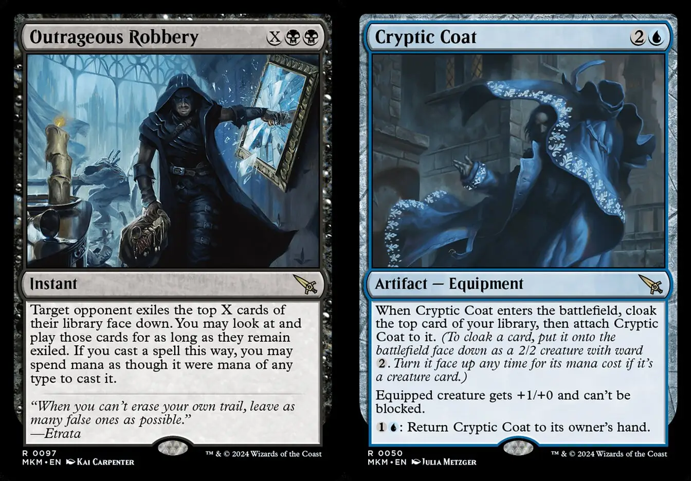 當隱密大衣進戰場時,匿伏你的牌庫頂牌,然後將隱密大衣貼附於其上。(匿伏某牌的流程,是將該牌牌面朝下地放進戰場,當成2/2、具守護{2}的生物。如果該牌是生物牌,則可隨時支付其魔法力費用使其翻回正面。)