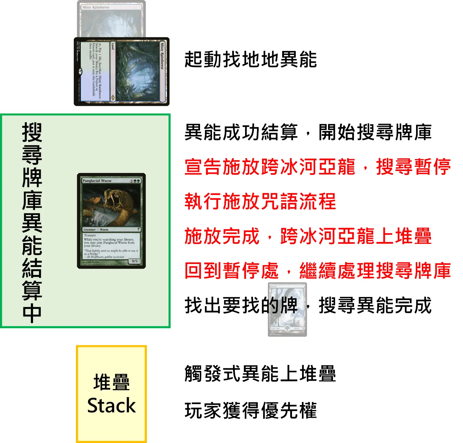 當你在搜尋自己的牌庫時,若自己牌庫中有跨冰河亞龍,在你搜尋出你要找的牌之前,你可以宣告從牌庫中施放跨冰河亞龍,然後遊戲會從這個搜尋牌庫的效應中暫停,先去處理跨冰河亞龍的施放流程(這能使你突破生物咒語一般的時機與施放區域限制),施放咒語的流程中也包含了起動魔法力異能的時機,當你完成施放咒語流程後,跨冰河亞龍會上堆疊,但此時不會有任何玩家獲得優先權,遊戲要回到原本暫停的位置,繼續處理完搜尋牌庫效應,等到這個咒語或異能結算完畢時,施放觸發的異能才會進入堆疊,然後玩家獲得優先權。