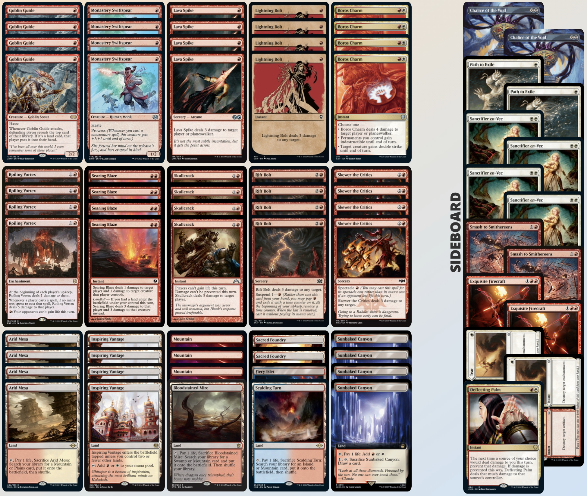 然後我就被打臉了,現在的紅白燒牌表跟過去差的可不是一點半點,Eidolon of the Great Revel 直接從牌組中消失,取而代之的是 Roiling Vortex;同時 Lightning Helix 也消失了,全部改為 Skullcrack 這種針對性極強的牌。