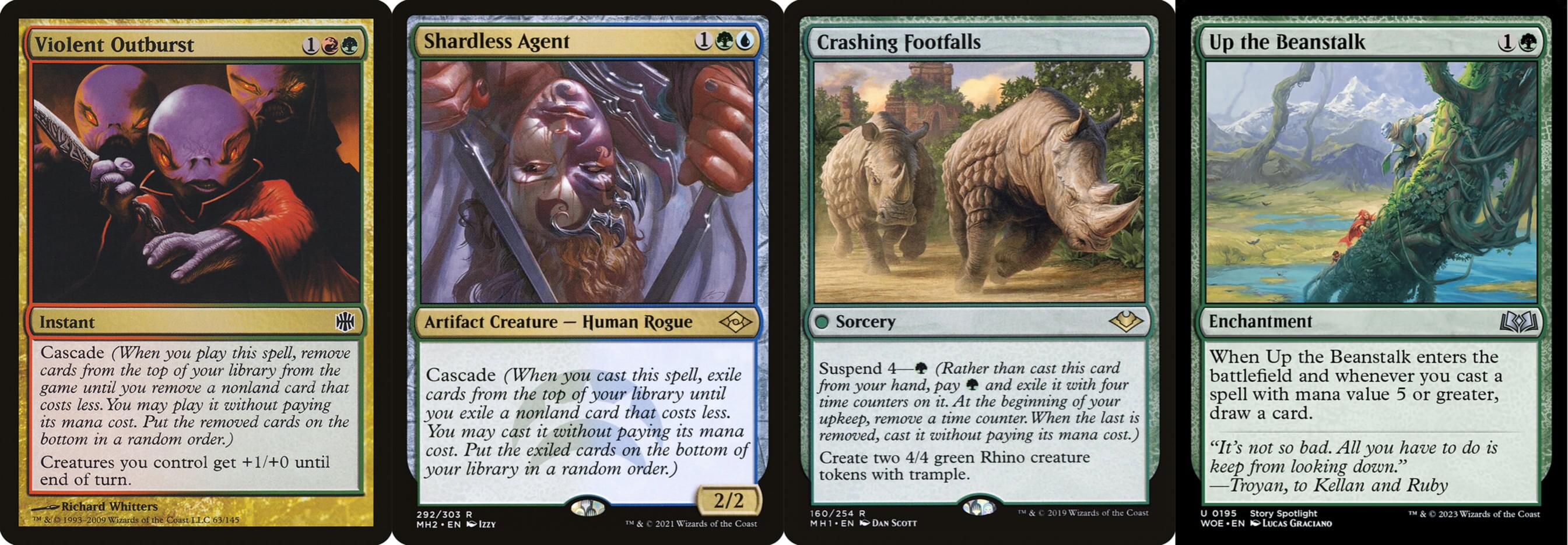 而 Cascade 則是另一個極端,找出最暴力的場面(Shardless Agent 轉出 Crashing Footfalls)或是找出大量抽牌的元件(轉出 Up the Beanstalk),靠對手沒辦法追上的場面差/資源差壓死對手。