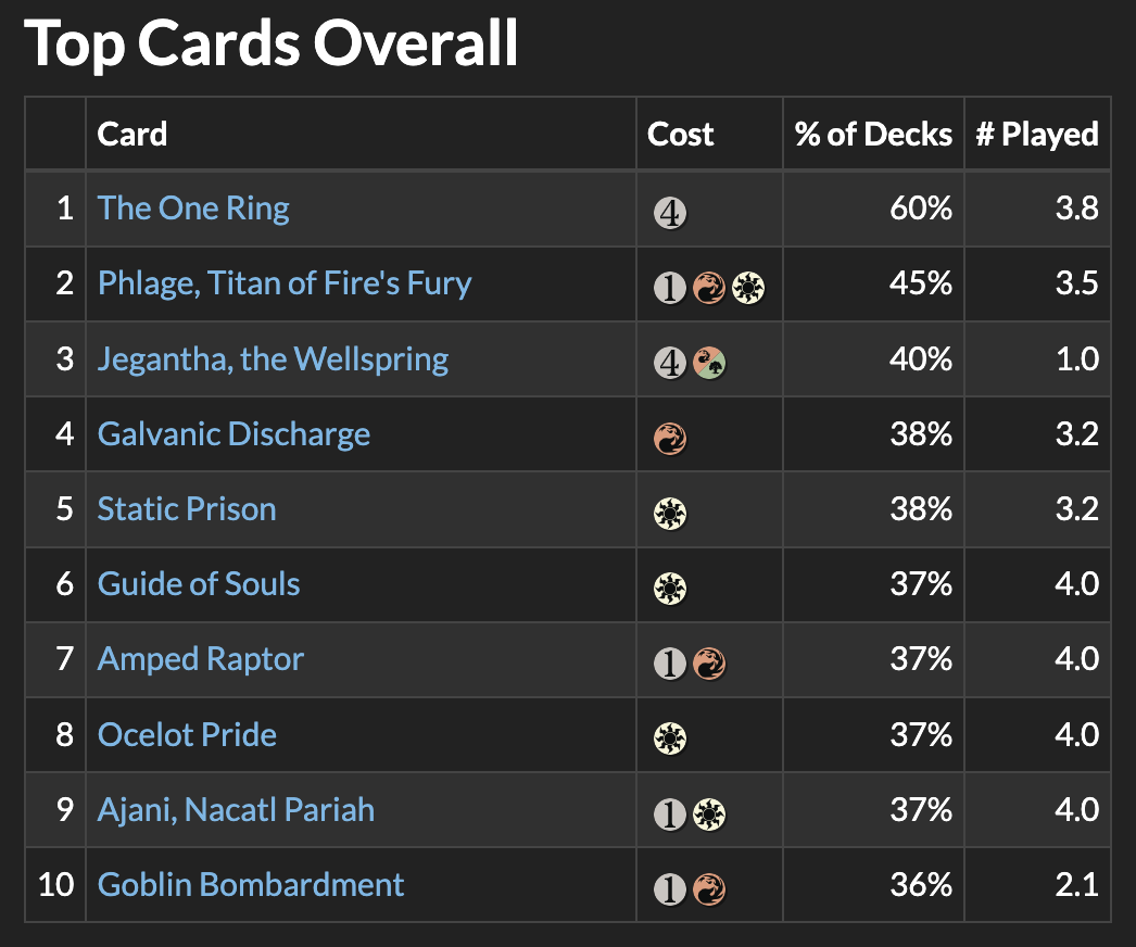 這類幾乎只有 WRx Energy 在用的單卡的使用率,會發現去掉 WRx Energy 後,大概只有 20% 左右的套牌在使用 The One Ring